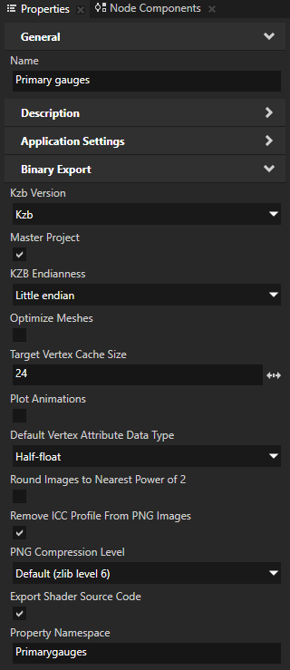 For example, to access in the Gauges kzb file namespace a property type named Speed, use Gauges.Speed. - Name to access the property type in shaders.
