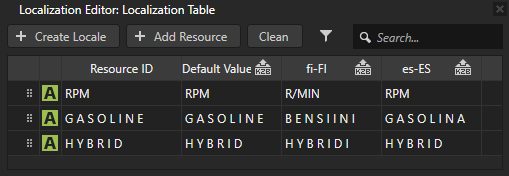 2. In the Library > Localization double-click the localization table you created in the previous step to open it in the Localization Editor, add the locales to which you want to localize themes, and localize the text resources. See Localizing text resources.