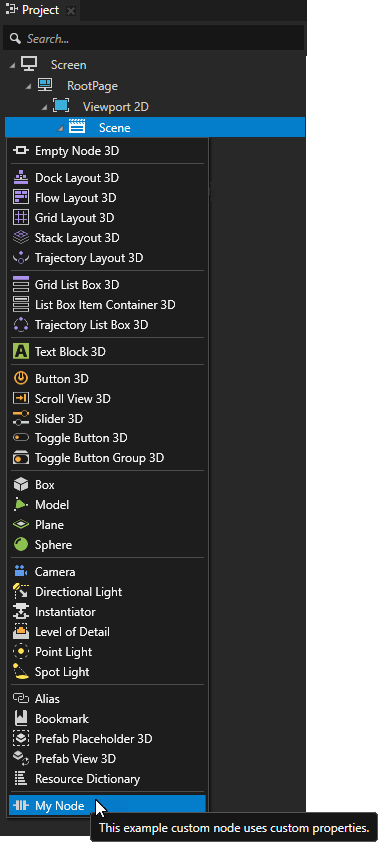 5. In the Project select a node to which you want to add your node, press Alt and right-click, and select My Node.