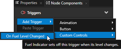 For example, to allow the Kanzi Studio user to add a trigger called On Fuel Level Changed which is set off when the fuel level of a custom node called Fuel Indicator changes: