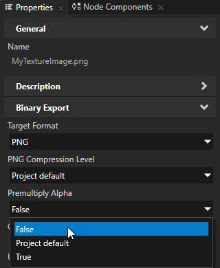 当您导出 kzb 文件时,Kanzi Studio 默认用阿尔法值乘以 RGB 值。要更改此设置,在 > 中使用 预乘阿尔法 (Premultiply Alpha) 属性。您可以重写想要使用不同设置的图像文件中的该属性值。例如,将您 Kanzi 应用程序动态加载的未预处理纹理图像的 预乘阿尔法 (Premultiply Alpha) 设置为 False,这些图像使用不进行 RGB 颜色阿尔法预乘运算的片段着色器。