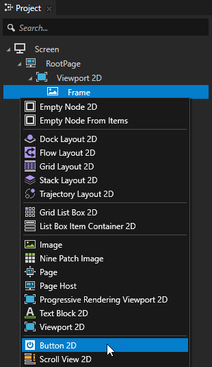 - 在工程 (Project) 中按下 Alt 并右键点击Frame 节点并选择2D 按钮 (Button 2D)。