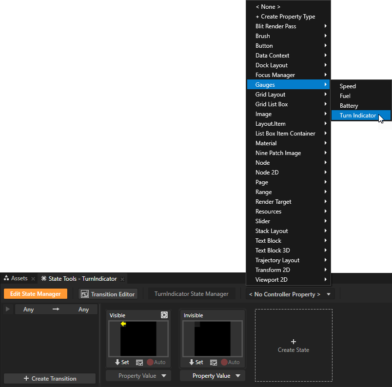 - 在状态工具 (State Tools) 中点击<No Controller Property> 并选择Gauges > Turn Indicator。