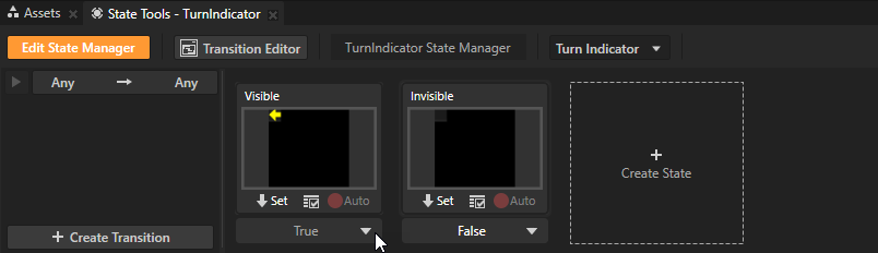 - 在预设件 (Prefabs) 中选择 TurnIndicator 预设件,并在状态工具 (State Tools) 中点击创建状态机 (Create State Manager)。