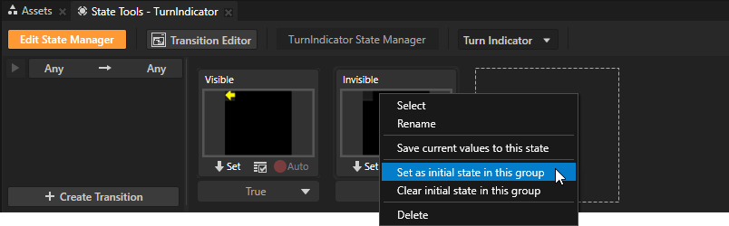 - 在状态工具 (State Tools) 中右键点击Invisible 状态并选择设置为本组的初始状态 (Set as initial state in this group)。