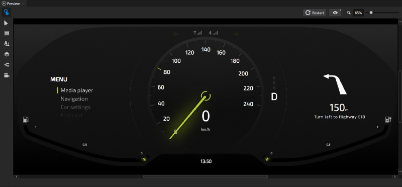 在本教程中,您学习了如何创建指示灯并通过属性使用 Kanzi 状态机来控制。从您在本教程中使用的工程的资产 (Assets) 中,可以找到车灯、安全带、轮胎温度和挡风玻璃液体指示器的图像。您可以使用在本教程中学到的方法,将速度表下方的这些指示灯添加到时钟的左侧和右侧。