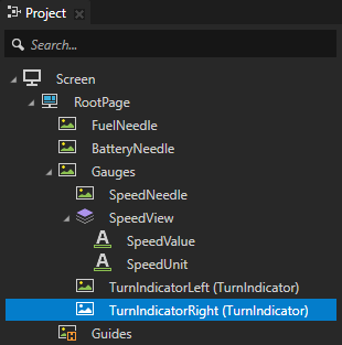 - 从预设件 (Prefabs) 拖动TurnIndicator 预设件到工程 (Project) 并将其放在 Gauges 节点上,选择 TurnIndicator 节点,按下 F2 键,并将节点命名为 TurnIndicatorLeft。