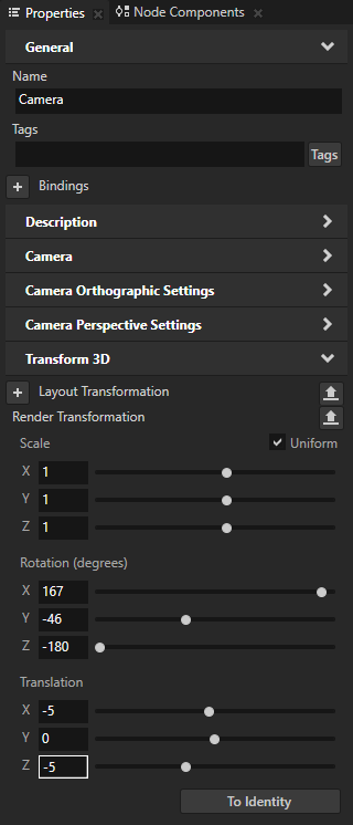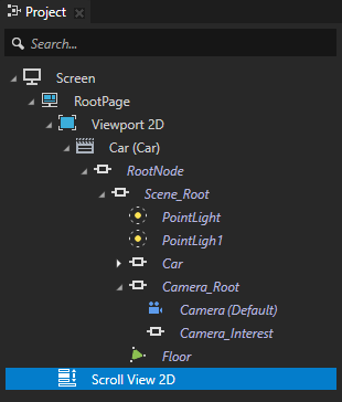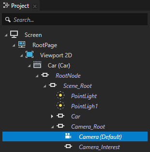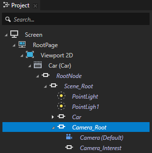 1. 工程 (Project) 中选择RootPage > 2D 视口 (Viewport 2D) > Car > RootNode > Scene_Root > Camera_Root,并在属性 (Properties) 中将渲染变换 (Render Transformation) 属性 平移 Z (Translation Z) 属性字段设置为 0。