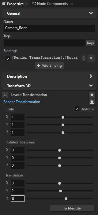 3. 工程 (Project) 中选择RootPage > 2D 视口 (Viewport 2D) > Car > RootNode > Scene_Root > Camera_Root 节点,在属性 (Properties) 中点击绑定 (Bindings) 属性旁的 ,以添加该属性,并在绑定参数编辑器 (Binding Argument Editor) 中设置: