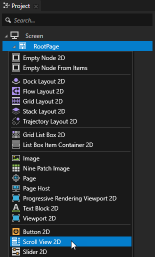2. 工程 (Project)按下 Alt 并右键点击 RootPage 并选择 2D 滚动视图 (Scroll view 2D)