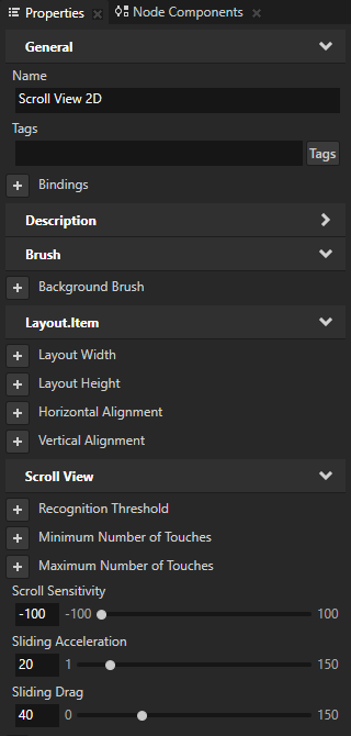 通过滑动加速 (Sliding Acceleration)滑动阻力 (Sliding Drag) 属性,您可以调整滚动视图 (Scroll View) 节点在您释放滑动指针后如何移动对象。例如,在释放鼠标按钮后,或者手指离开设备屏幕后。要调整当按住滑动指针时滚动视图 (Scroll View) 节点如何移动对象,使用拖动加速 (Dragging Acceleration)拖动阻力 (Dragging Drag)拖动脉冲 (Dragging Impulse) 属性。