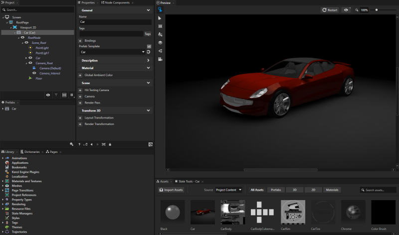 工程包含Car 预设件,其中包括车辆模型、灯光、摄像机和车底地板。