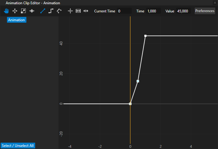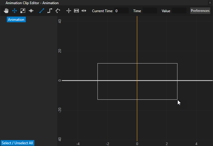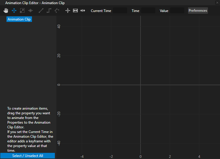 - 在工程 (Project) 中,选择要动画化其属性值的节点,然后将属性 (Properties) 中要动画化的属性拖到动画剪辑编辑器 (Animation Clip Editor) 中。
