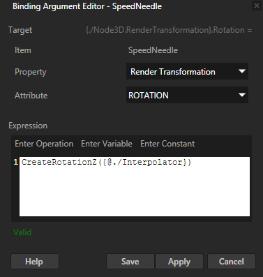 5. 工程 (Project) 中,选择要插值其旋转角度的 3D 节点,并在属性 (Properties) 中添加绑定 (Bindings) 属性,然后在 绑定参数编辑器 (Binding Argument Editor) 中设置: