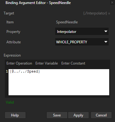 当希望动态设置属性的目标值并随着时间的推移将当前值插值到目标值时,请使用属性目标插值器 (Property Target Interpolator)。例如,使用属性目标插值器 (Property Target Interpolator) 可以将仪表指针的旋转角度插值到目标值中,无论其当前位置如何。