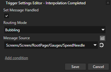 例如,如果希望在RootPage 节点中了解属性目标插值器 (Property Target Interpolator) 何时在 SpeedNeedle 中完成属性插值,请在触发器设置 (Trigger Settings) 中将消息源 (Message Source) 设置为 SpeedNeedle 节点。