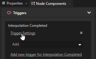 4. 节点组件 (Node Components) > 触发器 (Triggers) 部分中,在您在上一步添加的 插值完成 (Interpolation Completed) 触发器中,点击触发器设置 (Trigger Settings) 并将消息源 (Message Source) 属性设置为具有您要了解它何时完成插值的属性目标插值器 (Property Target Interpolator) 的那个节点。