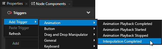 3. 节点组件 (Node Components) > 触发器 (Triggers) 部分中,右键点击并选择添加触发器 (Add Trigger) > 动画 (Animation) > 插值完成 (Interpolation Completed)