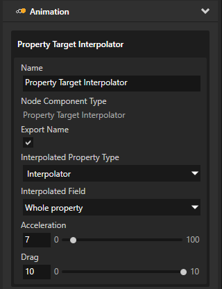 4. 节点组件 (Node Components) > 动画 (Animation) 区域的 属性目标插值器 (Property Target Interpolator) 中设置:
