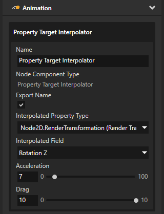 当更改用于控制旋转角度的属性的值时,属性目标插值器 (Property Target Interpolator) 会随着时间的推移将值逐渐更改为目标值。要更改插值,请在属性目标插值器 (Property Target Interpolator) 中调整加速 (Acceleration)阻力 (Drag) 属性的值。
