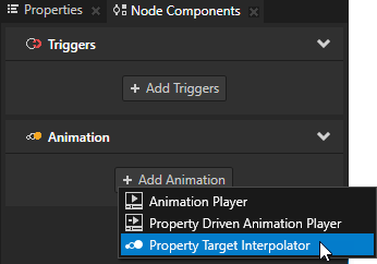 3. 节点组件 (Node Components) > 动画 (Animation) 区域中点击+ 添加动画 (+ Add Animation) 并选择属性目标插值器 (Property Target Interpolator)