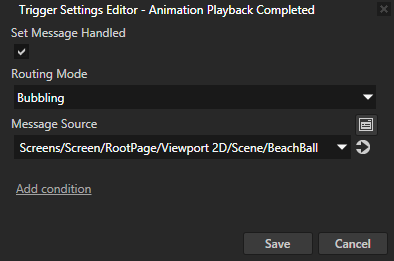 例如,如果希望在RootPage 节点中获取 BeachBall 节点的动画信息,请在触发器设置 (Trigger Settings) 中将消息源 (Message Source) 设置为 BeachBall 节点。