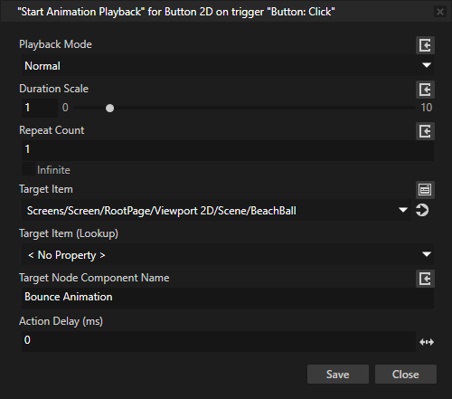 动画播放器 (Animation Player) 中设置的值之外,Kanzi 还应用 起始动画回放 (Start Animation Playback) 动作中的 回放模式 (Playback Mode)持续期间缩放 (Duration Scale)重复计数 (Repeat Count) 属性值。