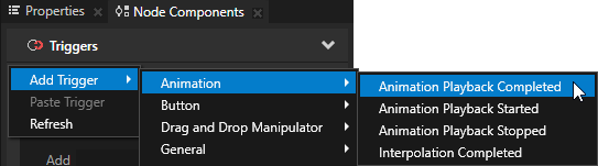 3. 节点组件 (Node Components) > 触发器 (Triggers) 部分中,右键点击并选择添加触发器 (Add Trigger) > 动画 (Animation),然后选择提供了您所需动画状态信息的那个触发器: