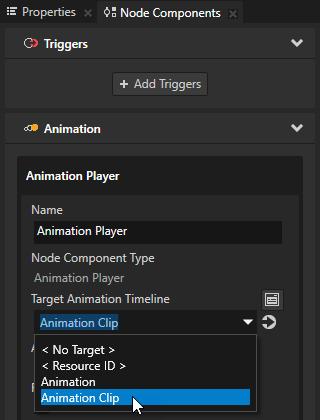 3. 节点组件 (Node Components) > 动画 (Animation) 部分中,在您创建的动画播放器 (Animation Player) 中,将目标动画时间线 (Target Animation Timeline) 属性设置为要使用的动画。
