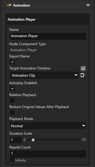 • 重复计数 (Repeat Count) 用于设置动画的播放次数。 在重复计数 (Repeat Count) 属性中,您启用无限 (Infinite) 属性时,动画播放器 (Animation Player) 会无限次播放动画。