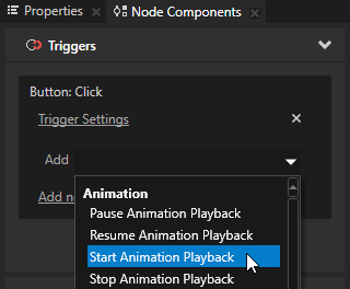 5. 节点组件 (Node Components) > 触发器 (Triggers) 中,为触发器添加要在动画播放器 (Animation Player) 发送您的触发器所拦截的消息时执行的动作。