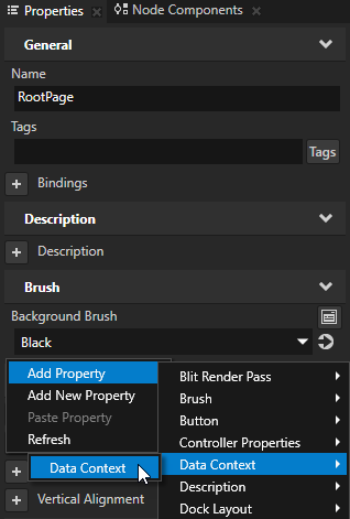 例如,将数据上下文 (Data Context) 属性添加并设置到RootPage 节点。