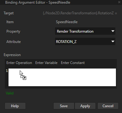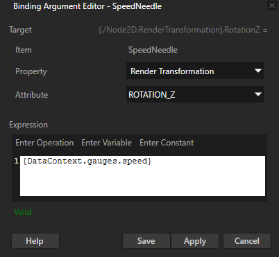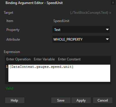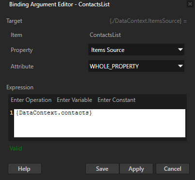 • 对于有多个字段的属性,请在属性 (Properties) 中添加绑定 (Bindings) 属性,并在绑定参数编辑器 (Binding Argument Editor) 中将: