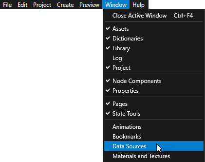要在您的 Kanzi Studio 工程中使用数据源,请选择窗口 (Window) > 数据源 (Data Sources)