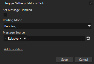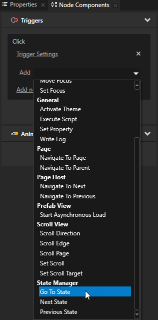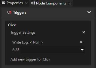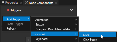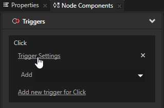 1. 工程 (Project) 中,选择要为其添加触发器的节点,并在节点组件 (Node Components) > 触发器 (Triggers) 部分添加其中一个点击触发器。