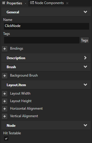 3. 工程 (Project) 中选择您在上一步中创建的节点,在属性 (Properties) 中添加可测试命中 (Hit Testable) 属性,并将其设置为启用。