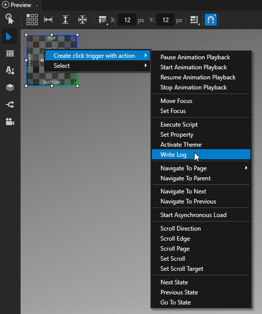 2. 预览 (Preview) 中选择节点工具 (Node tool) ,右键点击要对点击作出反应的节点,在通过动作创建点击触发器 (Create click trigger with action) 菜单中选择一个动作。
