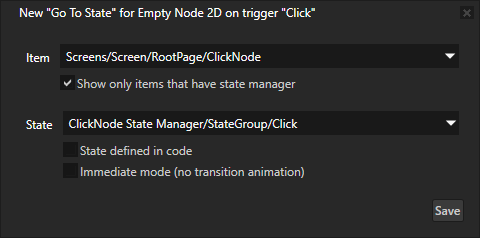 例如,创建状态机,您可以定义状态以设置节点在不同的点击触发器被触发时的外观。请参阅 创建状态机