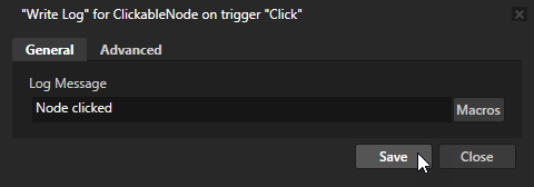 例如,点击写入日志 (Write Log) 动作并输入在用户点击该节点时要写入日志 (Log) 窗口的消息。