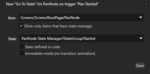 • 状态 (State) 设为设置节点在平移已启动 (Pan Started) 触发器被触发时的外观的状态