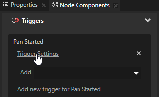 1. 工程 (Project) 中,选择要为其添加触发器的节点,并在节点组件 (Node Components) > 触发器 (Triggers) 部分添加其中一个平移操纵器 (Pan Manipulator) 触发器。