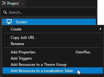 1. 工程 (Project) 中,右键点击屏幕 (Screen) 节点,并在上下文菜单中选择添加资源至本地化表 (Add Resources to a Localization Table)