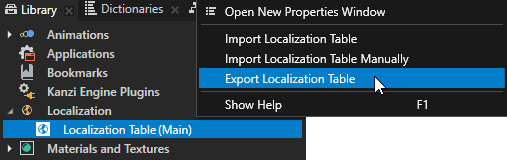 2. 素材库 (Library) > 本地化 (Localization) 中,右键点击包含要本地化的资源的本地化表,然后选择导出本地化表 (Export Localization Table)Kanzi Studio 会向 <ProjectName>/Localization/<LocalizationTableName> 中的 .pot 文件导出本地化表模板,同时向目录中导出与您在本地化表中拥有的地区数量相同的 .po 文件。