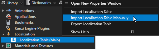1. 素材库 (Library) > 本地化 (Localization) 中,右键点击包含要对其使用 kzb 文件 URL 的资源的本地化表。