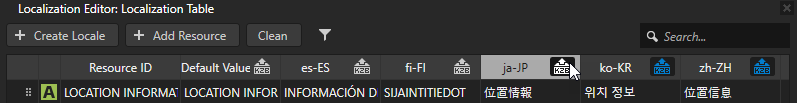2. 素材库 (Library) > 本地化 (Localization) 中双击任一本地化表,然后在本地化编辑器 (Localization Editor) 中点击您要导出到地区包中的资源的地区名称旁的