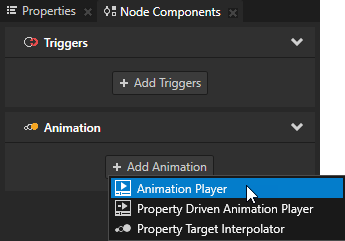 2. 节点组件 (Node Components) > 动画 (Animation) 区域中点击+ 添加动画 (+ Add Animation) 并选择动画播放器 (Animation Player)
