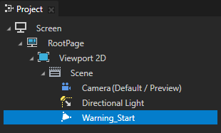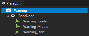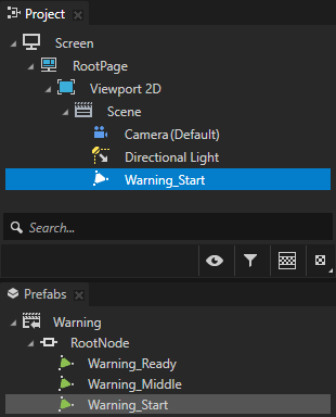 例如,在预设件 (Prefabs) 中复制Warning_Start 节点并在工程 (Project) 中将其粘贴到场景 (Scene) 节点。
