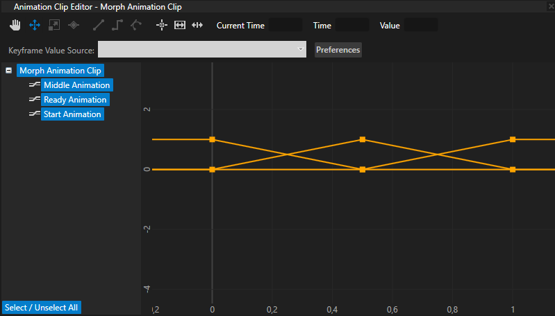 例如,要使用三个网格对变形进行动画化,请创建另外两个动画并将它们命名为 Middle AnimationReady Animation,并设置: