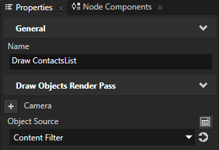 - 在素材库 (Library) > 渲染 (Rendering) > 渲染通道 (Render Passes) > Stencil Render Pass 中创建绘图对象渲染通道 (Draw Objects Render Pass),将其命名为 Draw ContactsList,在属性 (Properties) 中添加对象源 (Object Source) 属性,并将其设置为Content Filter标签过滤器 (Tag Filter)。