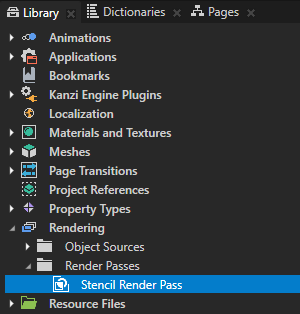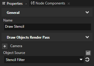 - 在素材库 (Library) > 渲染 (Rendering) > 渲染通道 (Render Passes) > Stencil Render Pass 中创建绘图对象渲染通道 (Draw Objects Render Pass),将其命名为 Draw Stencil,在属性 (Properties) 中添加对象源 (Object Source) 属性,并将其设置为Stencil Filter 标签过滤器 (Tag Filter)。